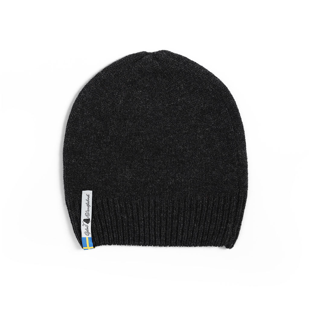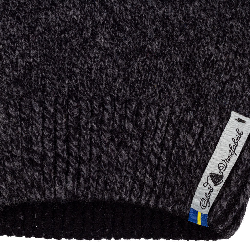 Made in Sweden, the hat is knit in a pattern inspired by simple work mittens. The traditional colors of charcoal and navy are practical and versatile.