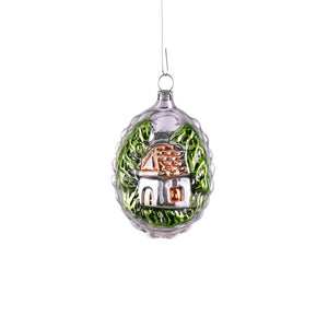 Handcrafted using a vintage mold, this German Christmas ornament features a cozy cabin nestled in the forest on one side, and girl dressed in festive red on the other.