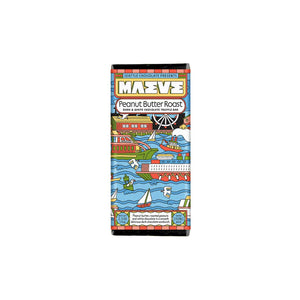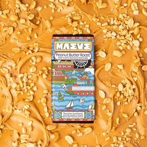 A delicious sandwich of peanut butter, roasted peanuts, and white chocolate forms three layers of melt-away magic in Maeve's Peanut Butter Roast Truffle Chocolate Bar.