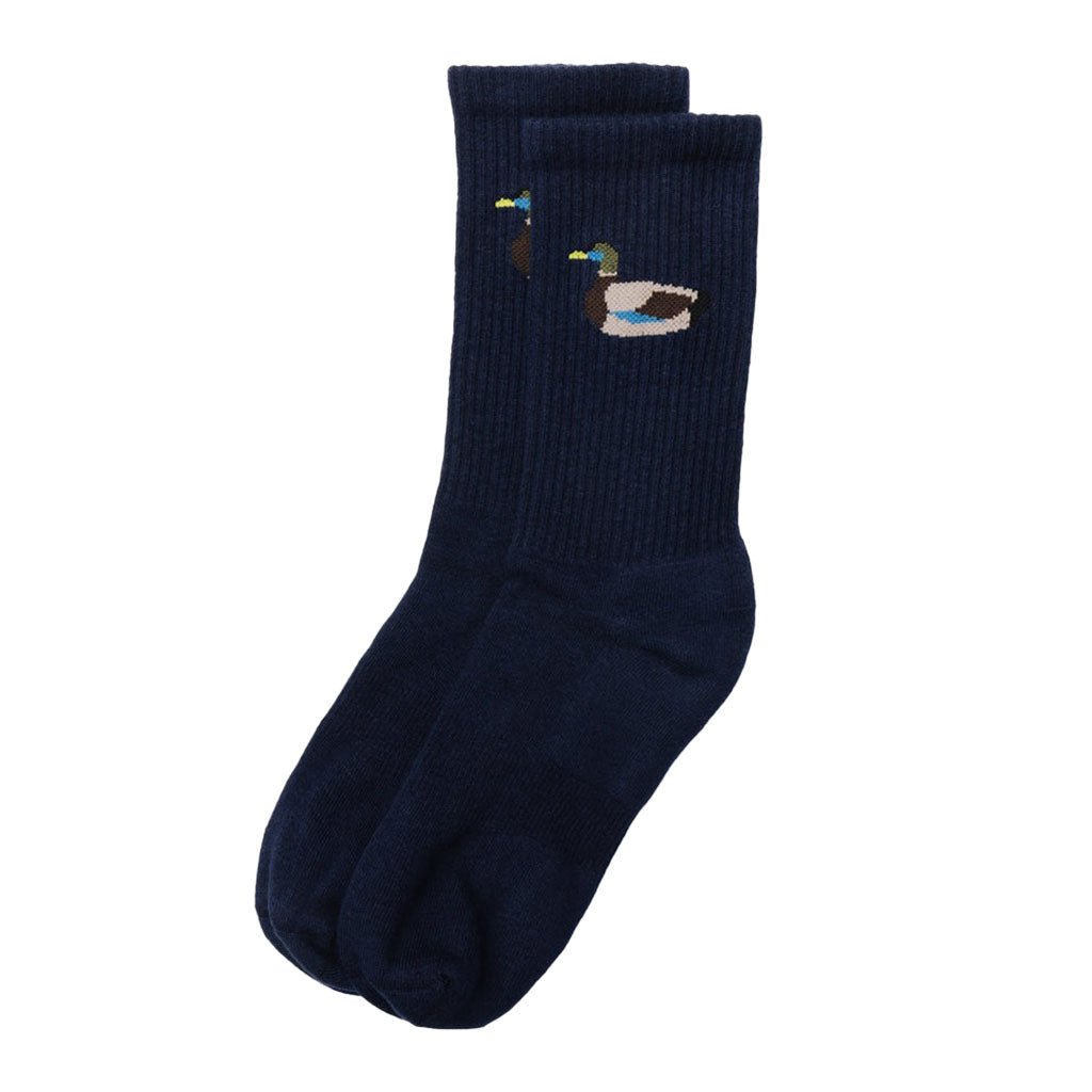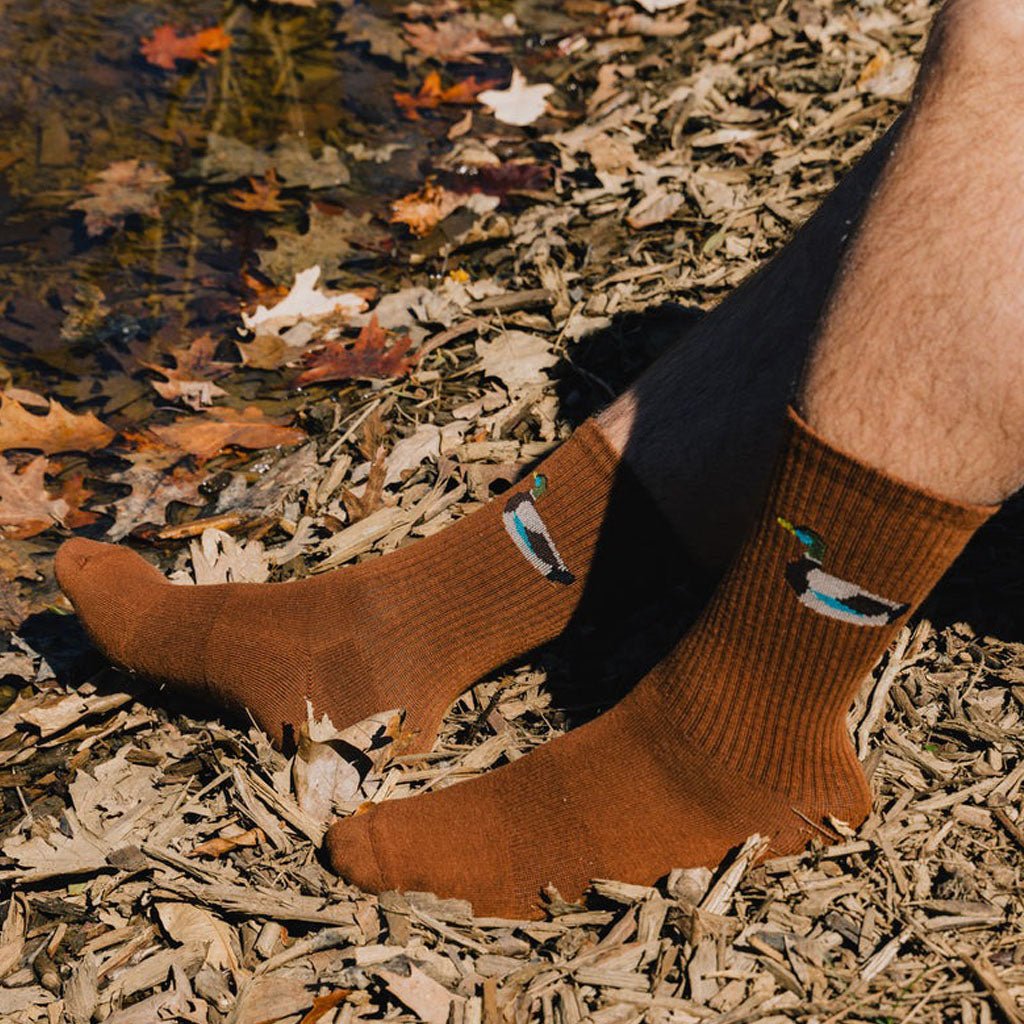 Knit in the USA with American combed cotton, these crew-length socks from American Trench have mallard ducks woven onto each ankle. Added spandex helps with shape retention and keeps the socks high on the leg.