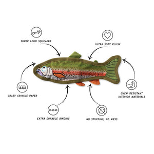 Catch of the Day Durable Dog Toy is built to last through the toughest play dates. Made with chew-resistant interior materials, extra durable binding, crazy crinkle paper, and a loud squeaker, this interactive trout was designed with extended playtime in mind. Whether you catch or release, we’re sure your pup will be hooked on this toy. Great for all-sized dogs and good for tough chewers.