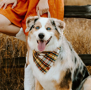 Foggy Doggy's cozy dog bandana is woven in a tartan plaid featuring handsome harvest colors. Made from soft, luxe flannel, this kerchief is double sided and provides an extra layer of warmth. Easy to tie and adjustable for a comfortable fit, it's perfect for dogs of many sizes. See our notes below about fit.