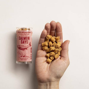Deliciously healthy Salmon Says treats for dogs and cats are made from potato flour, brown rice, and omega-3-rich salmon, so vitally important to maintain the luxurious sheen of your furry friend's coat. These bite-sized bits are packaged in a 2oz tube and are the perfect size for training.