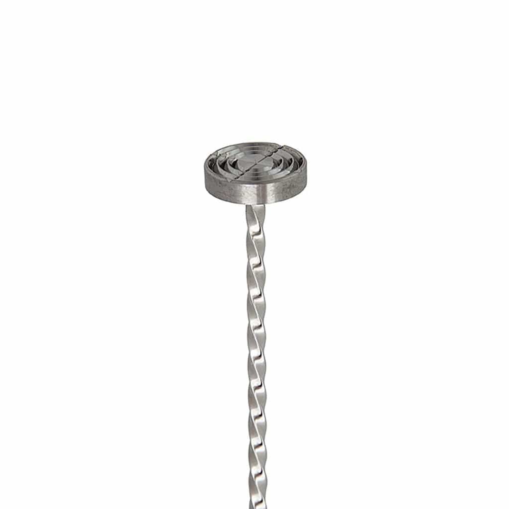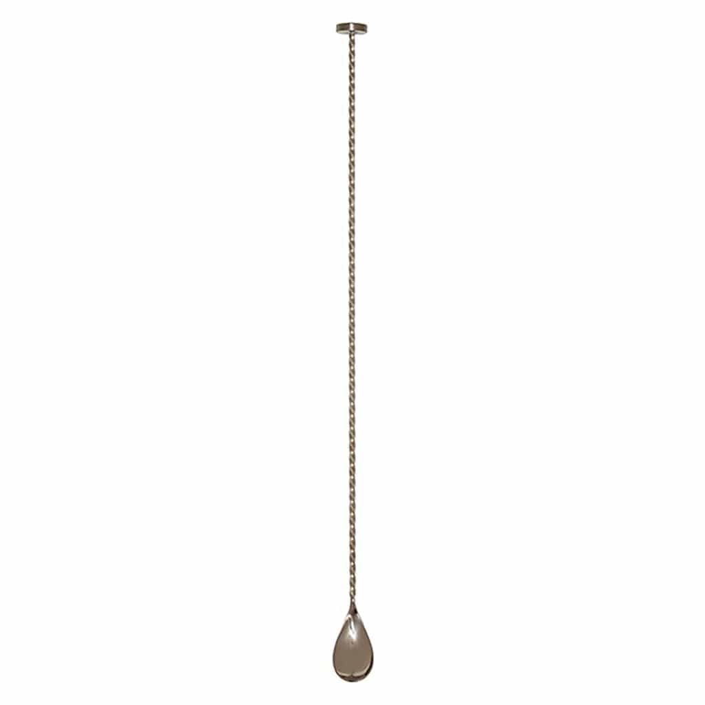 A long and elegant bar spoon that features a muddler top for dual-purpose use behind the bar.
