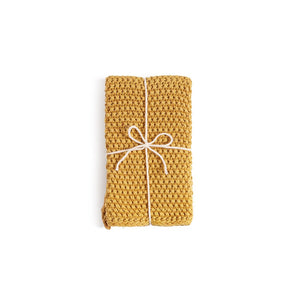 Several natural plants are used in the dying of these cloths, including weld and cutch (acacia)*. The ratio of plants used varies from batch to batch, resulting in cloths that range in color from rich, golden mustard to a deeper rust color.