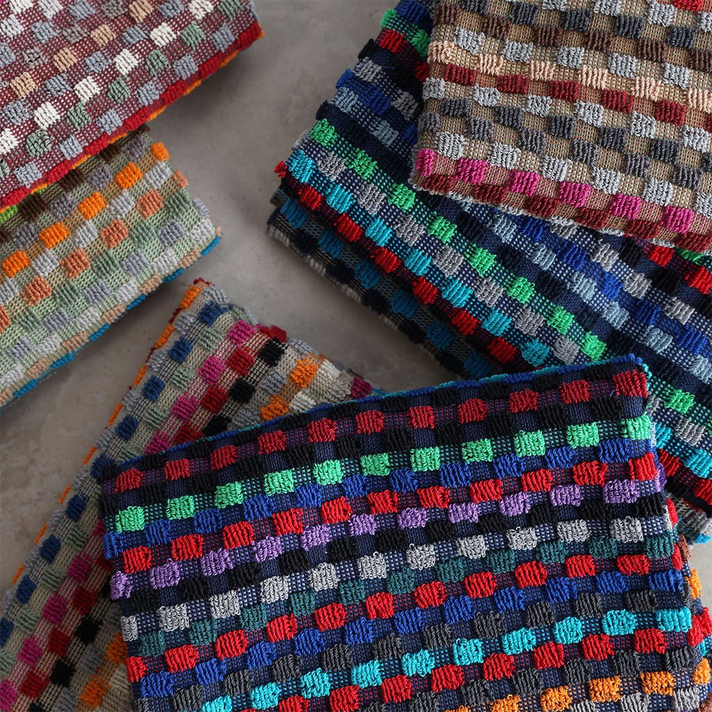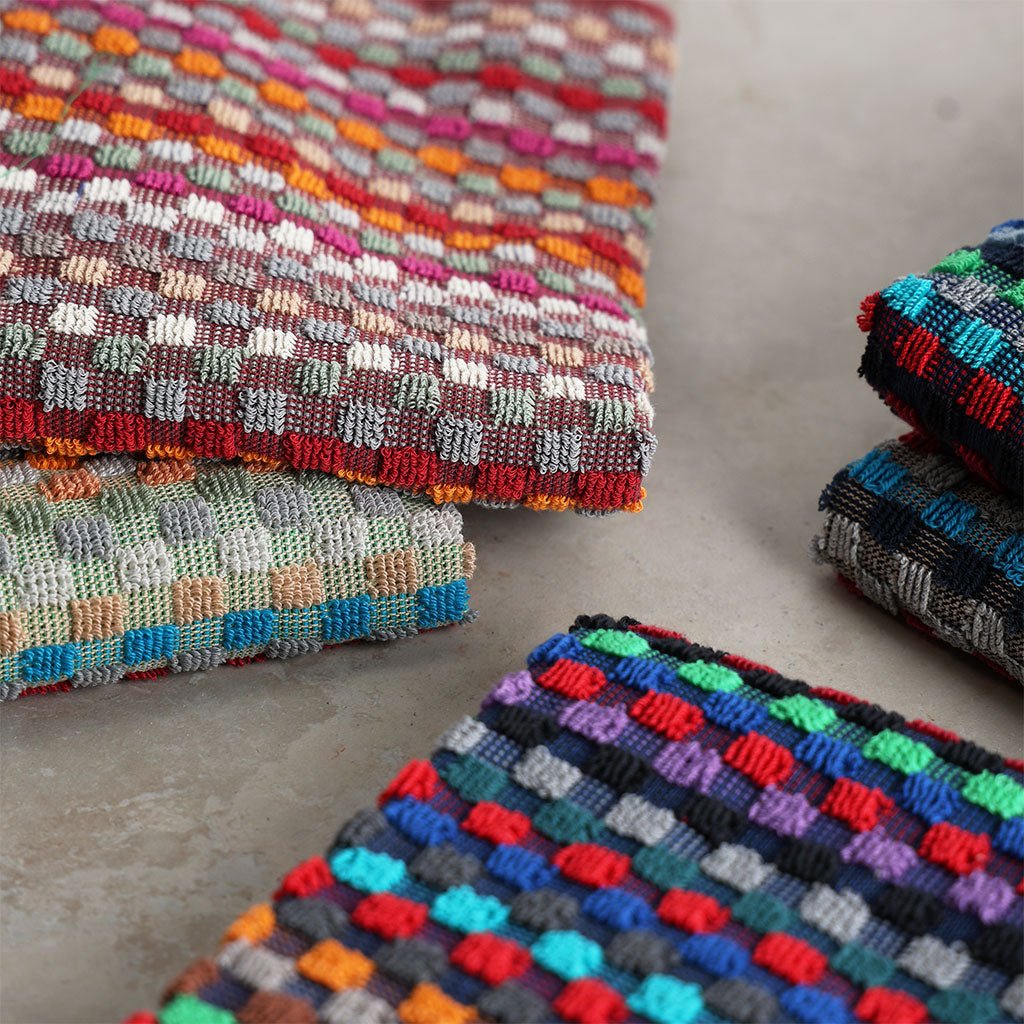 A generously-sized cotton hand towel with a thick weave and colorful checkerboard pattern. Also known as a "pit towel" in Germany, towels like these were favored by miners, who would use them to wrap up their lunches to be carried down into the pit. Keep them in the kitchen or in the bath, their absorbency and size make them handy in either location.