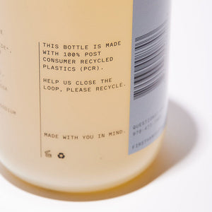 Packaging: Bottle is made entirely from post-consumer recycled (PCR) HDPE (essentially plastic from recycled milk jugs) and is curbside recyclable when rinsed thoroughly. The cap is made from polypropylene and is recyclable.