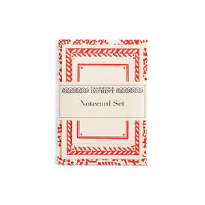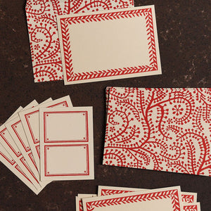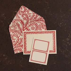 Cambridge Imprint’s boxed set of notecards, envelopes, and labels adds coordinated charm to everyday correspondence. Printed in rich crimson on cream stock, the designs feel festive for holiday notes yet timeless enough for year-round use. Each set includes notecards, envelopes, and address labels, in complementary patterns of borders, leaves, and "seaweed paisley".
