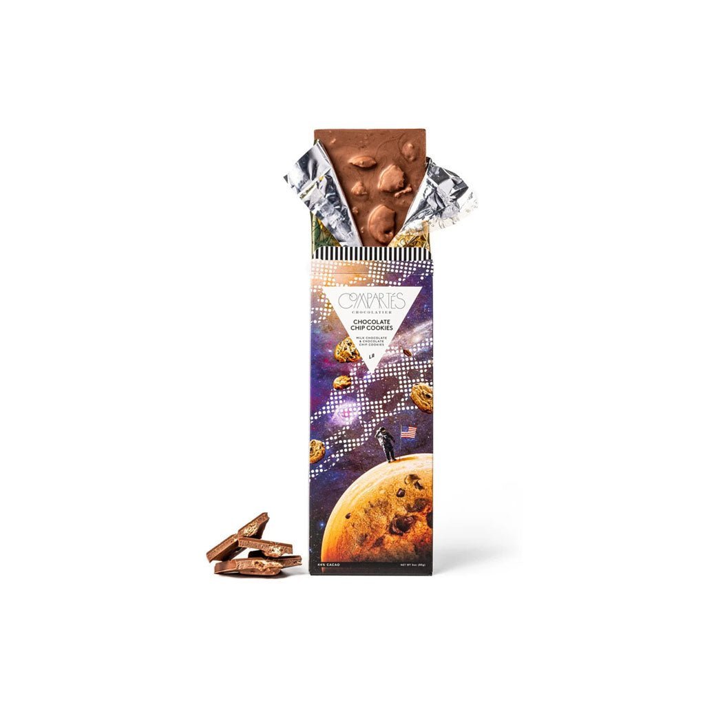 Compartés' Chocolate Chip Cookies Chocolate Bar is packed with milk chocolate and generous chunks of chocolate chip cookies for the ultimate sweet treat. Wrapped in a dreamy galactic design, it’s truly out of this world—almost too pretty to open.