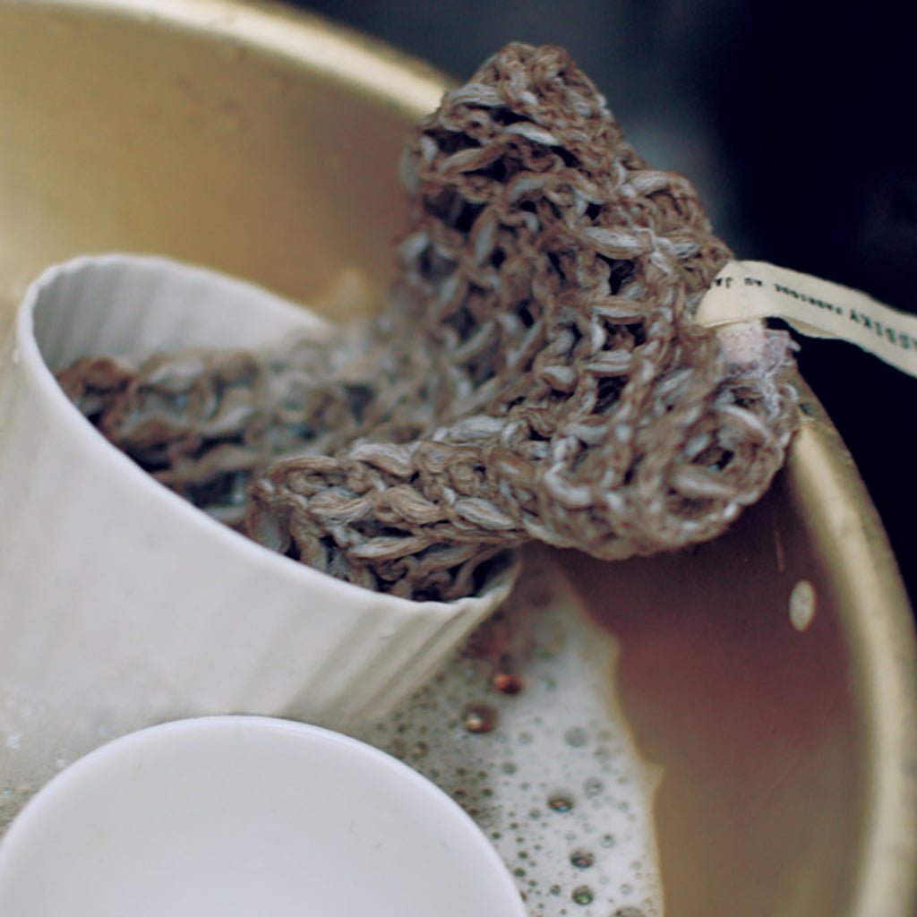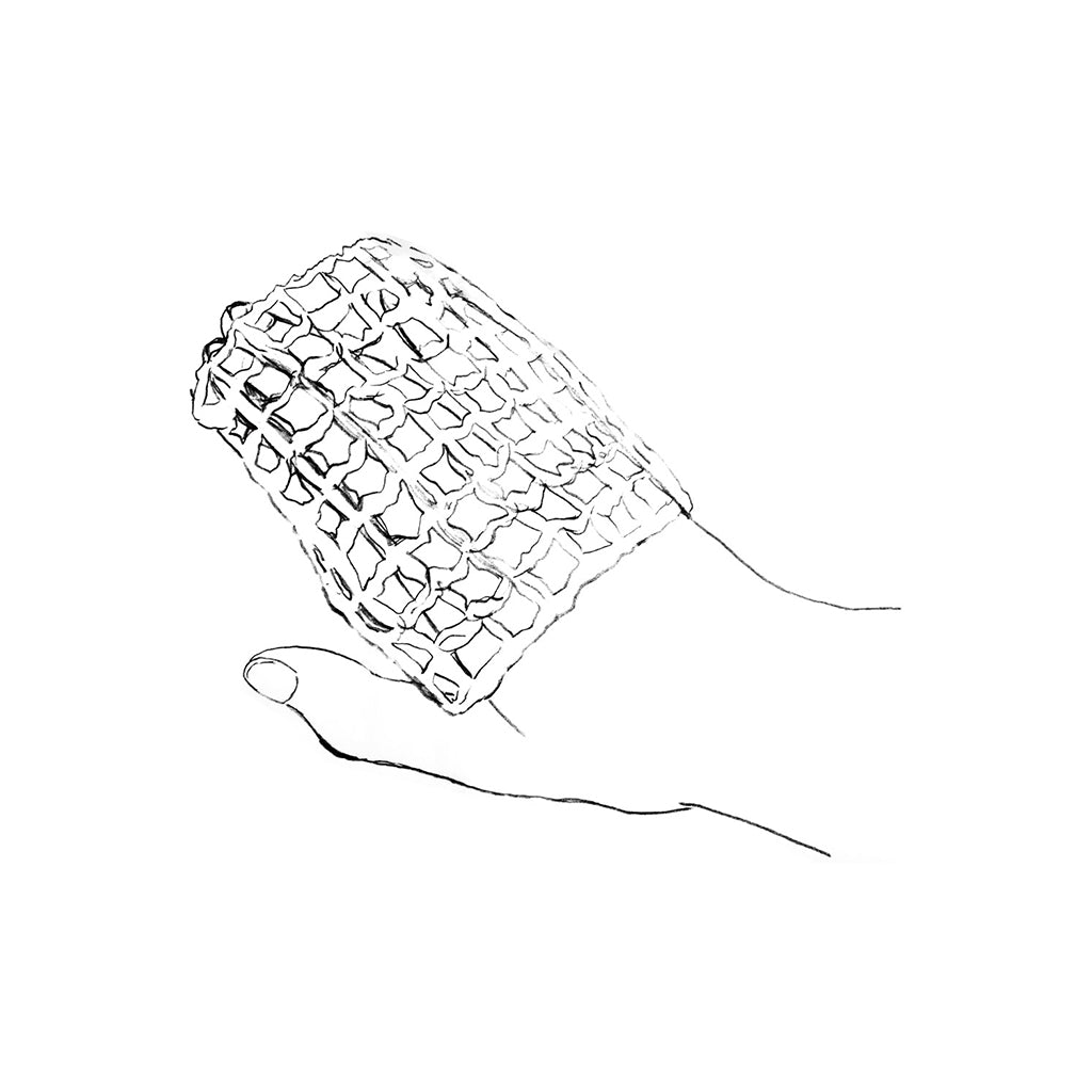 Use: Slide over your hand or else grip like a sponge. Saturate the cloth with water and apply your dish soap of choice. Rinse after use, squeeze out excess water, and hang to dry.