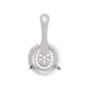 An updated version of the industrial Handy Strainer, based off patents from the early 1900s by Charles P. Lindley and Thomas Pick. This cocktail strainer features a die-cut shamrock at the base of the handle, a traditional electro-plated nickel silver finish, and a very tight coil that fits most standard mixing glasses. An embroidered velvet carrying pouch and a vintage-inspired box makes this a great gift for any bar enthusiast.