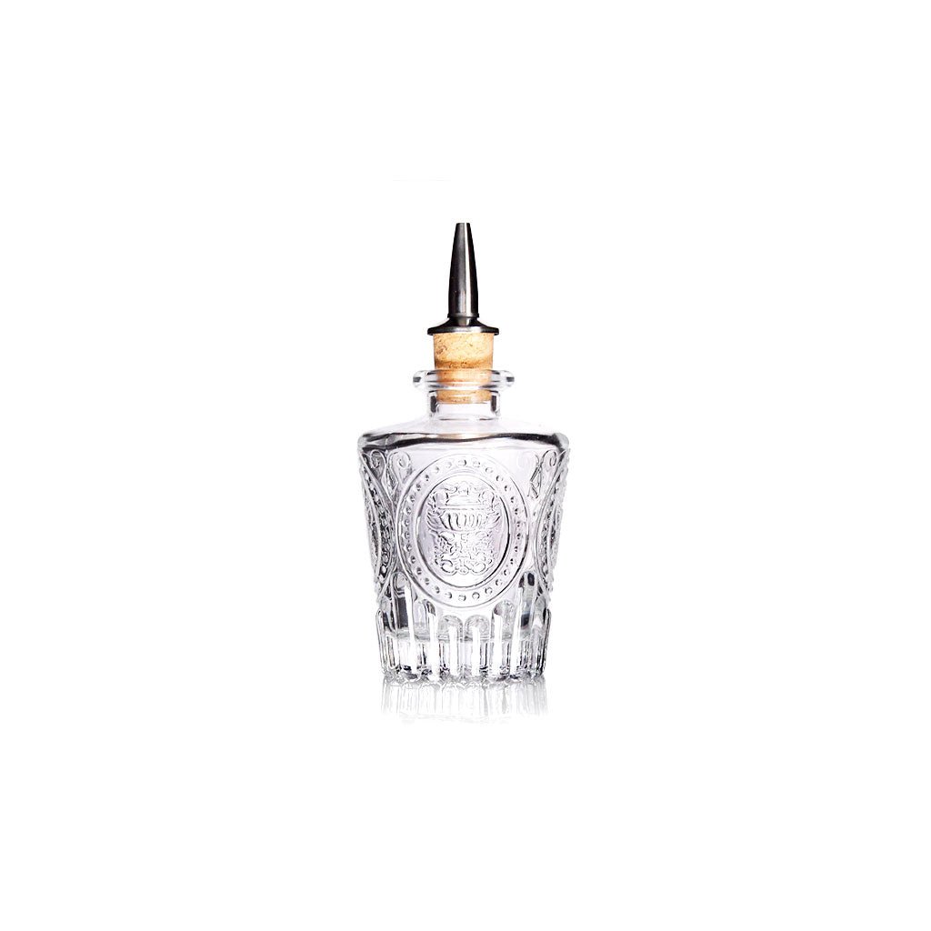The Bowdoin Bitters Bottle adds a touch of refinement to your barware, with a tapered shape, intricate emblems, and cut-glass styling.