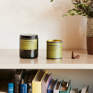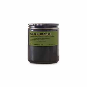 Geranium & Moss - A connection blend to soak up the present moment, with notes of soft sage, ginger root, lavender, and patchouli. Inspired by overgrown wildflowers rooted in fresh earth, formulated with upcycled cedarwood and sustainable patchouli.