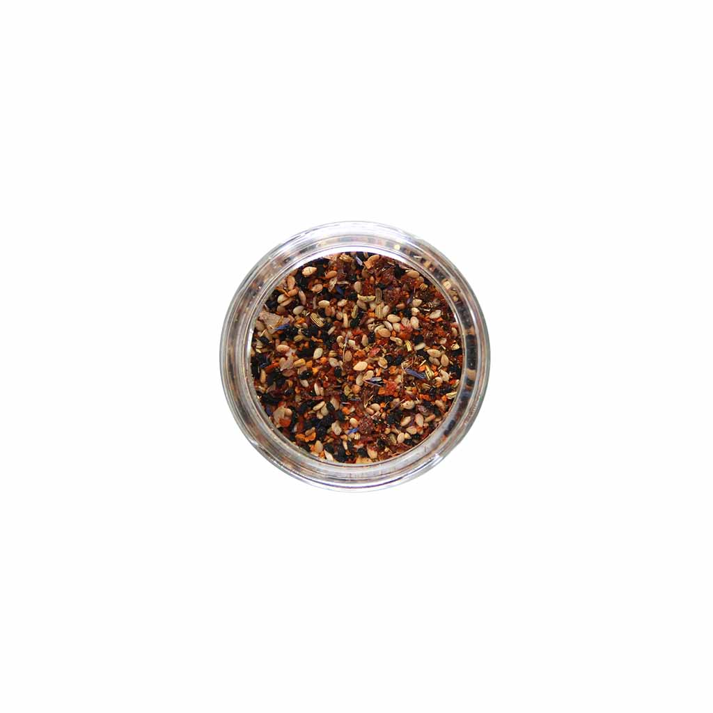 Ingredients: sesame, nigella, sumac, turmeric, fennel, maras (chile flakes, sunflower oil, salt), sea salt, blue cornflower