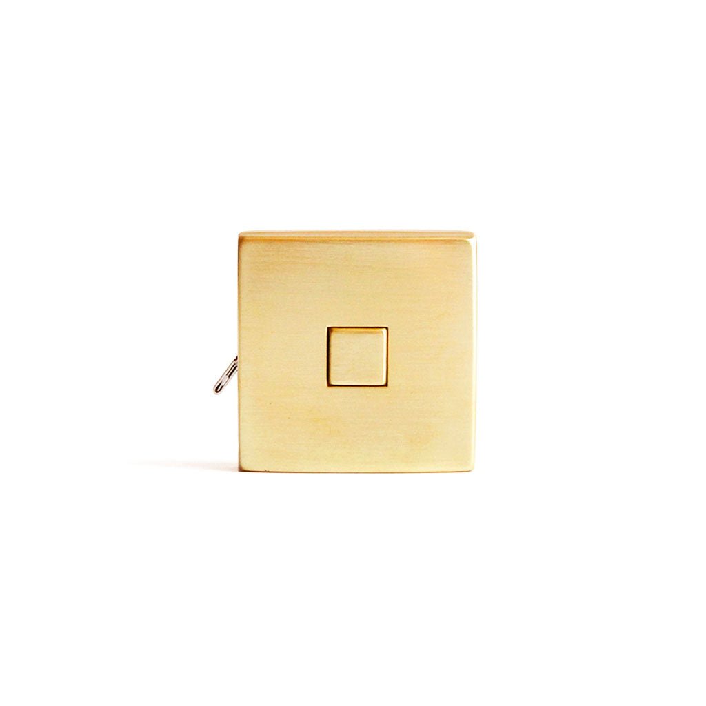 A compact, brass-encased tape measure with measurements in inches and centimeters and featuring a self-locking mechanism and self-retracting button.