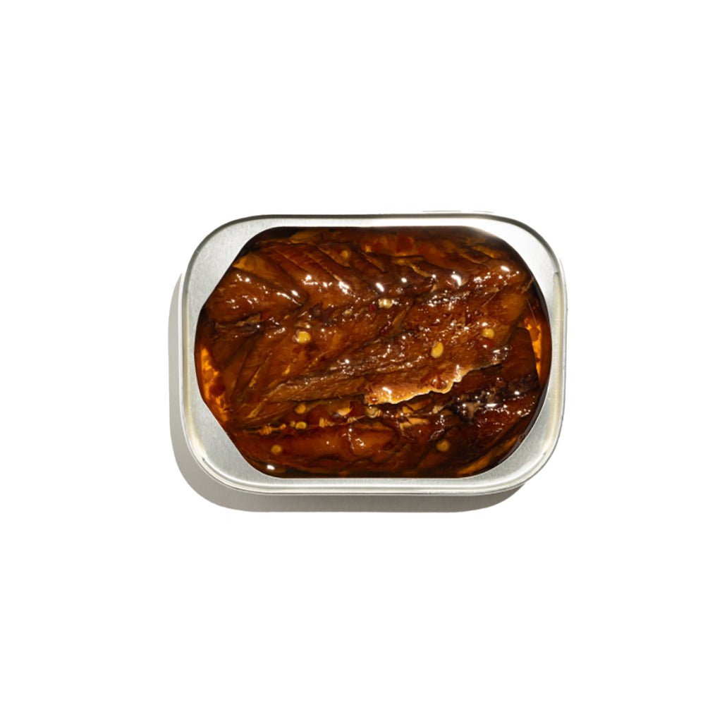 Slow Smoked Mackerel is hand-cut, sweet-cured, and slowly smoked over natural wood, then hand-packed and infused in-house with crushed chillis and garlic for a savory, rich flavor with a bite of heat.