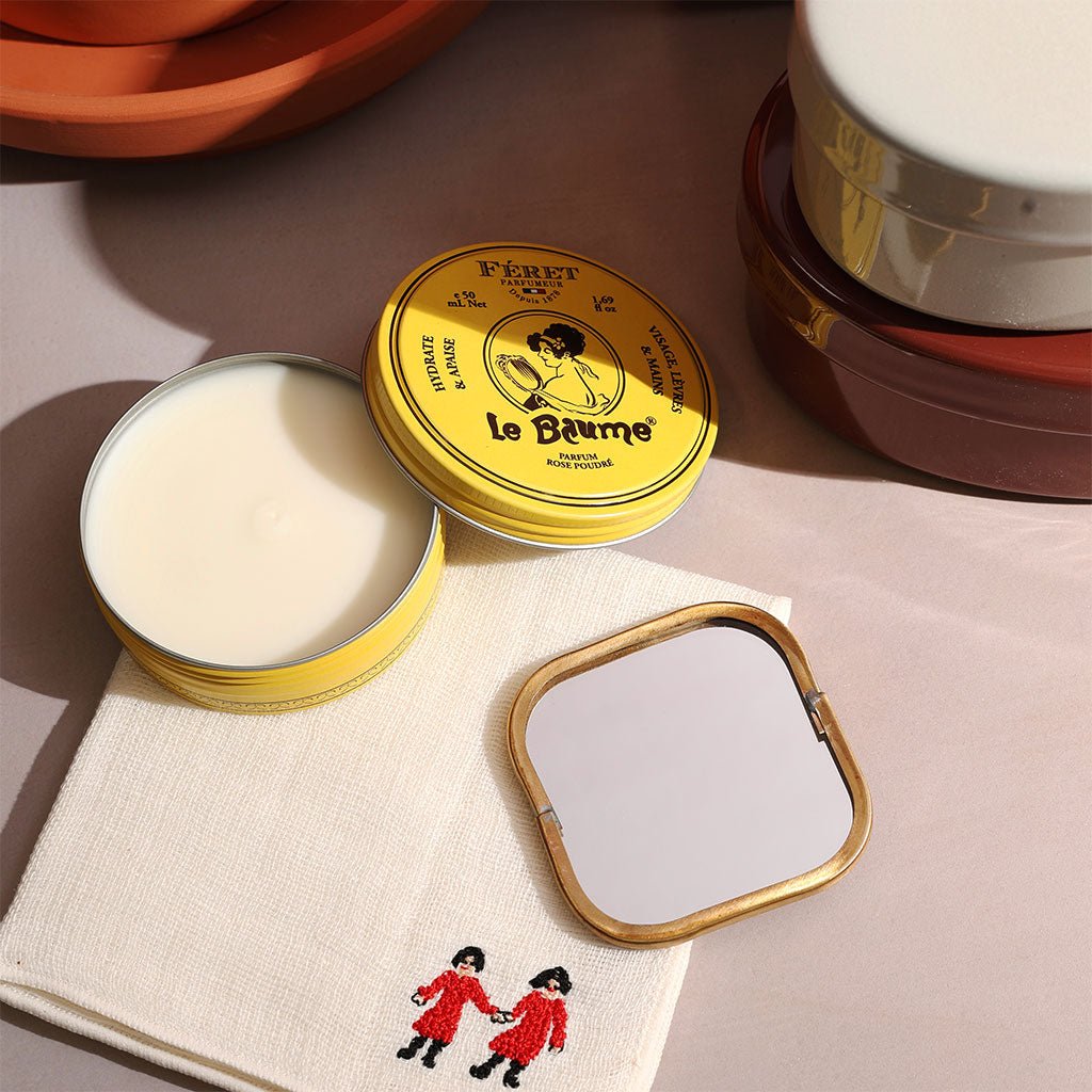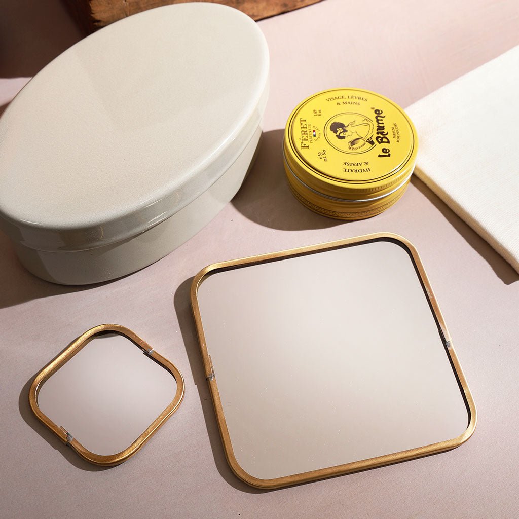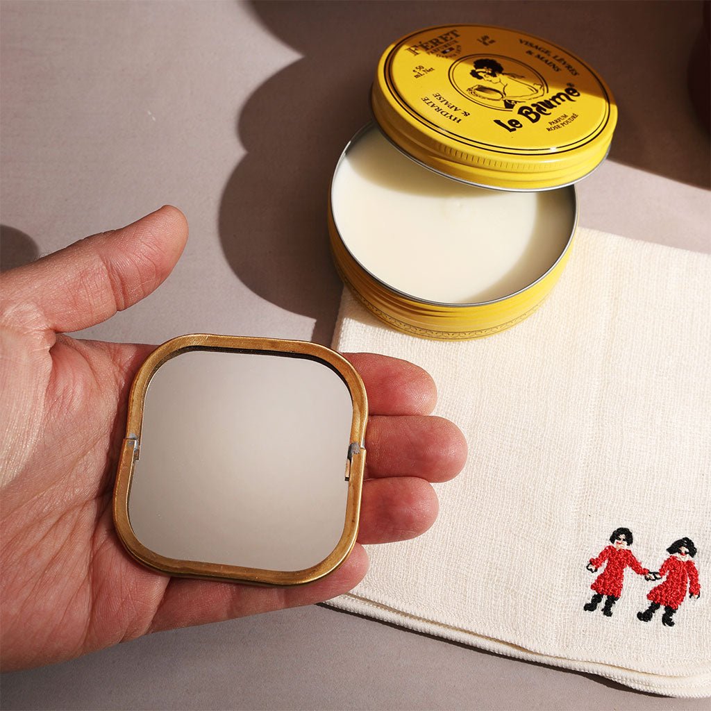 Fog Linen's compact mirror fits in the palm of your hand and features an antique-finished brass frame and backing. The brass-and-mirror construction offers a plastic-free alternative to traditional travel mirrors. It's easy to store in your cosmetic pouch, travel kit, or desk drawer, ensuring you're always prepared for quick touch-ups. A larger Brass Framed Mirror is available and features a hook on the back for hanging.