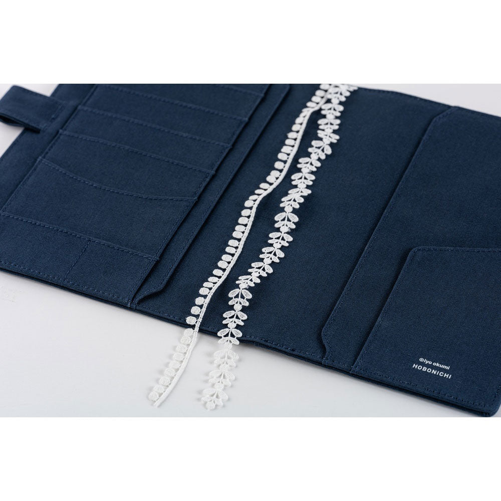 In a calming warm gray color, the A5 cover has butterfly-style pen loops to keep your writing utensil handy, while also securing the cover shut. The cover's outer design features one of iyo okumi's stunning embroidery pieces, with a white lace border accenting the charming motifs of animals and florals. When open, you'll find a clean and minimalist interior with plenty of pockets for keeping stickers, clippings, and other bits of daily ephemera.
