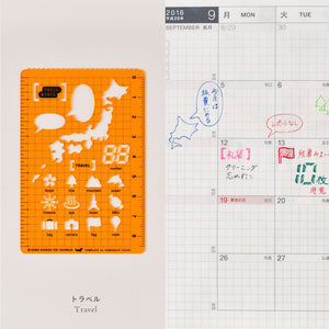 This small, acrylic stencil features symbols and marks that are useful when writing in your Hobonichi Techo. Designed to slip perfectly into the card pockets inside your Techo cover, this Travel Stencil includes an outline of Japan, symbols for hot springs and fireworks, and other icons for travel and vacation.