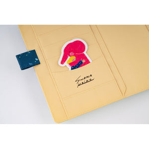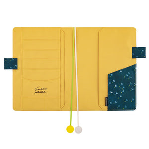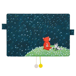 This cover fits an A5 size Hobonichi Techo Cousin, sold separately. It has “butterfly-stopper” pen holders that use a pen to hold the cover shut. This artwork piece depicts a scene of dandelion fluff being carried by the wind, and the bear and cat gazing raptly at them. At the end of the two bookmarks are charms reminiscent of dandelion flowers and fluff.