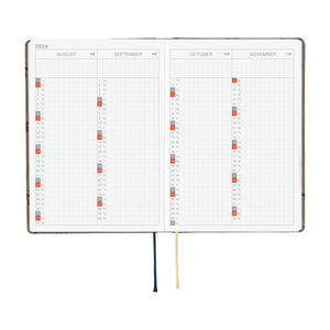 Like all Hobonichi planners, the HON has a thread-stitched binding that lays flat when open, and features Tomoe River paper—thin yet strong to keep the profile slim. Inside are the same daily spreads as the Original, each with a quote at the bottom, plus monthly and yearly calendars. Pages are color-coded by month for easy navigation. An A6 pencil board is included, offering a firm writing surface, straight edge, and page marker in one.