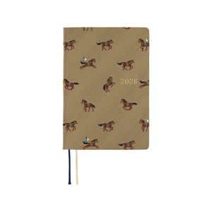The Hobonichi Techo HON A6 has the same contents as the Techo Original, but in a built-in hardcover—so it can be used without an additional cover. This design, Galloping Horses, is part of Hobonichi’s Bow & Tie series and features necktie fabric woven with motifs of running horses on a beige background, creating a playful cover with a soft, textural feel. The year 2026 is stamped on the cover and spine.