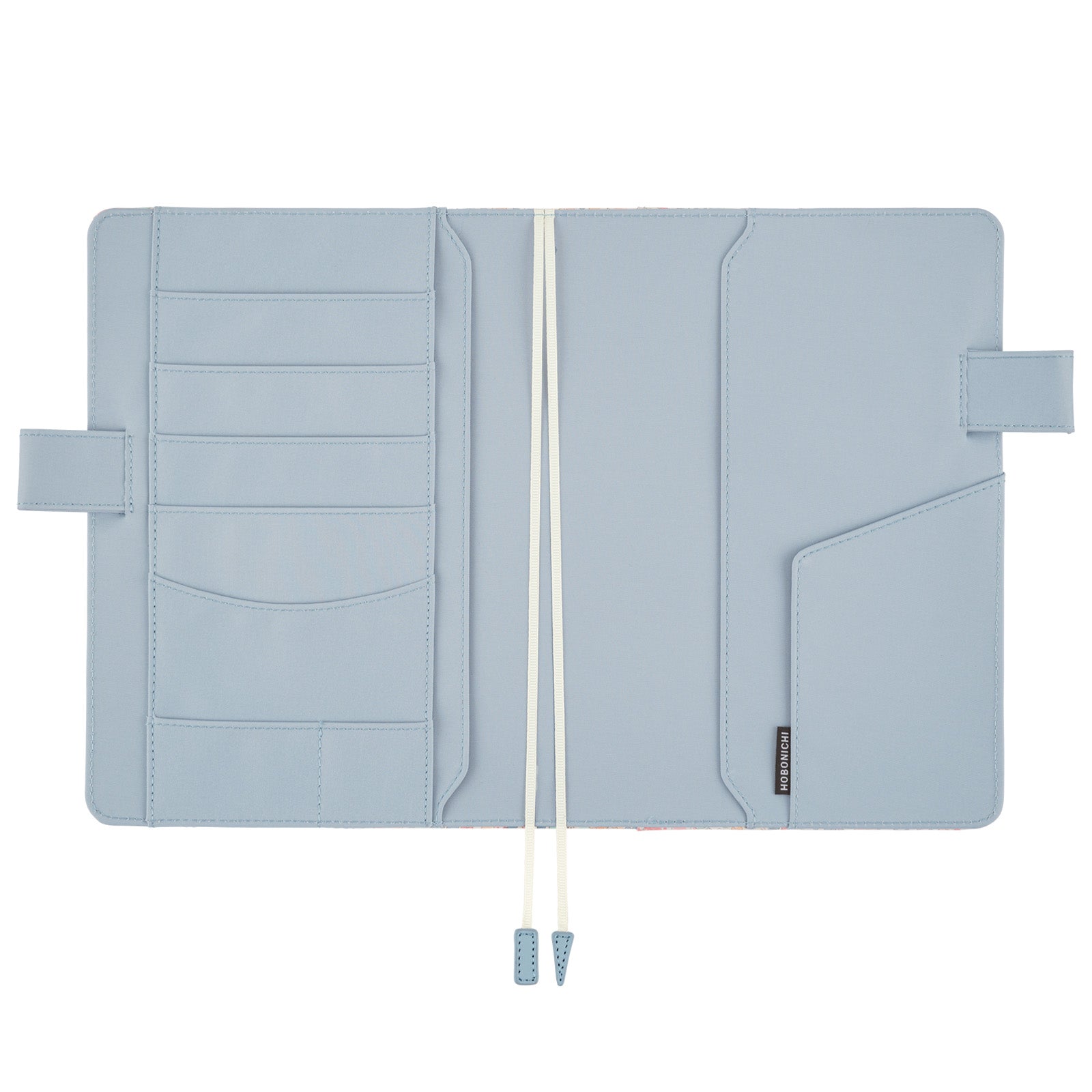 A fabric cover designed to fit the Hobonichi Techo Cousin A5. The Liberty of London print was originally released in 1933 and features an array of flowers in tones of light pink, orange, vermillion, red, and sky blue as well as pale navy. The butterfly pen holders function as a clasp to keep the cover securely closed with a pen, and ribbon bookmarks help you keep track of important pages in your planner.
