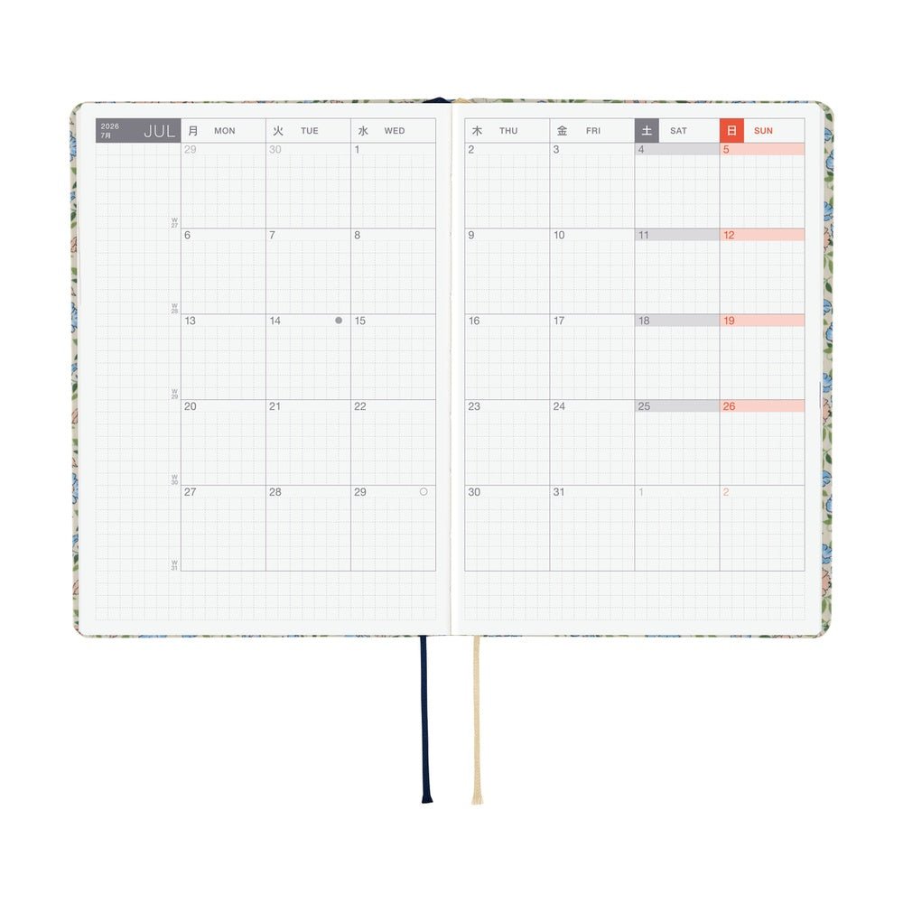 The Hobonichi Techo HON A6 has the same contents as the Techo Original, but in a built-in hardcover—so it can be used without an additional cover. A balance of sophistication and charm, this botanical print by Liberty Fabrics features pink and light blue blooms among a bed of green leaves—evoking a calm springtime meadow. The year 2026 appears on the front, foil-stamped in gold over the soft cotton fabric.