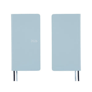 The Hobonichi Techo Weeks is a compact planner with a weekly spread, offered in a variety of cover designs and colors. Leather: Snow Blue has a pale blue leather cover, finished with navy-and-white headbands for reinforcement and decoration. Finished with two silk ribbon bookmarks in light blue and navy.