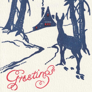 From the heart of the forest to your mailbox, send warm holiday wishes this season. Letterpress printed by hand, this rustic Saturn Press greeting card features a woodland friend wandering through the wintry forest outside a snow-dusted cottage. Smoke drifts from the chimney, hinting at a cozy night by the fire—a classic scene of a peaceful winter evening.