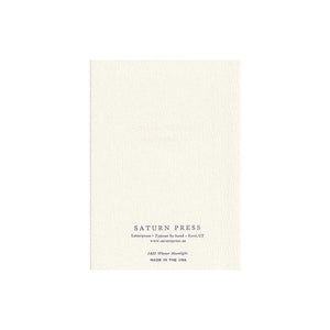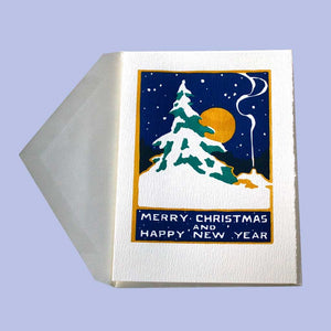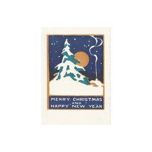 Send warm holiday wishes from beneath the winter stars. Letterpress printed by hand, this Saturn Press greeting card features a moonlit night sky above a cottage nestled in snowy woods. Smoke drifts from the chimney, hinting at a cozy evening by the fire—a peaceful winter scene to wish your recipient well into the New Year.