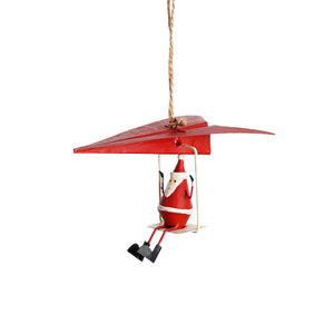 Fly into the holiday season with this festive Santa with Hang Glider ornament. Hand-painted with delicate detail, this retro-inspired metal ornament features a jolly Saint Nick on a merry adventure soaring through wintry skies—bringing a whimsical touch to your Christmas tree.