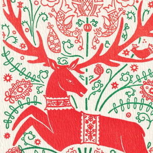 Send warm Christmas wishes with this festive forest friend. This charming Saturn Press holiday greeting card features a letterpress-printed, folk-art inspired design of a reindeer framed by ornate ornaments and classic red and green motifs.