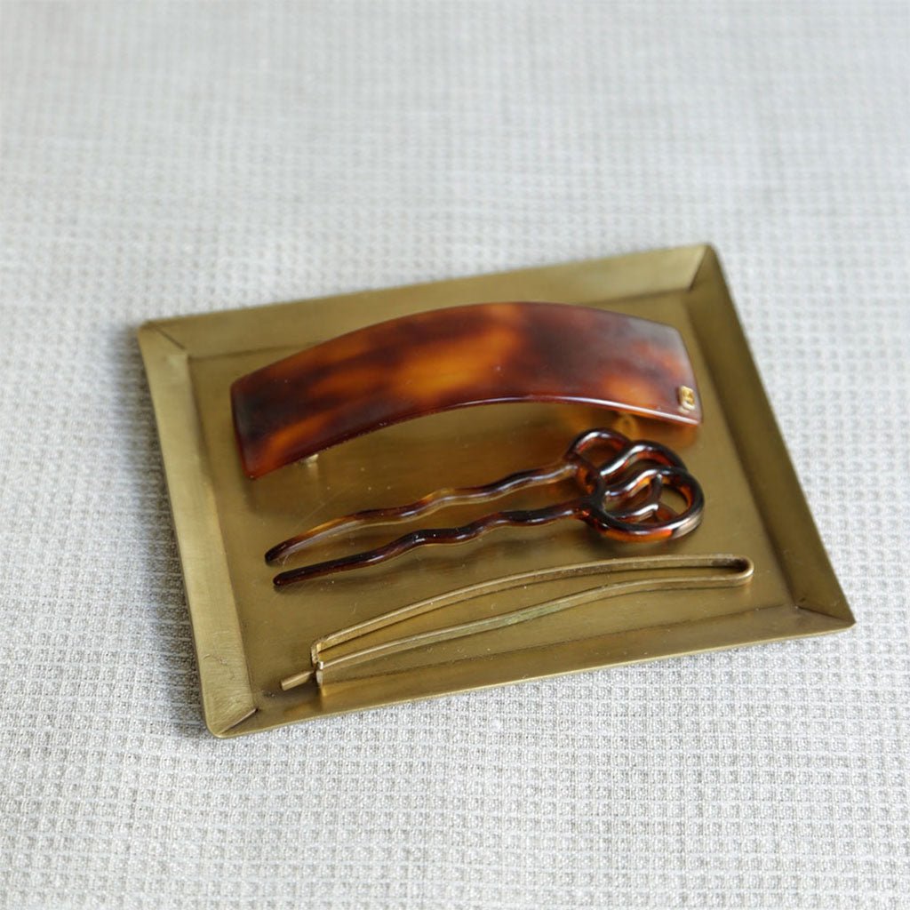 A simple plate for collecting life's small ephemera. Made of solid brass, Fog Linen's rectangular dish has gently beveled sides and a polished finish. Over time, the brass will develop a beautiful patina.