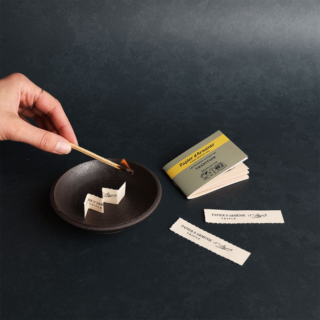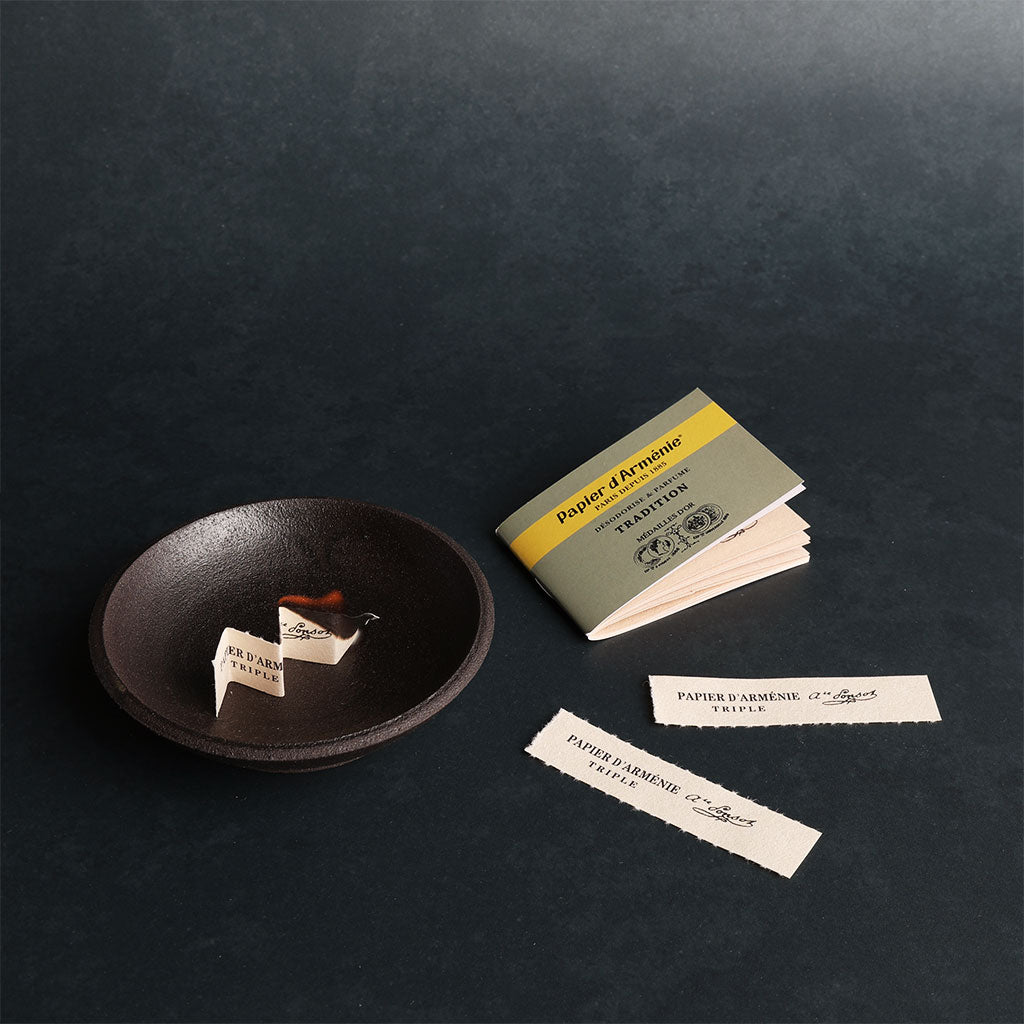 Use: Tear off one strip, fold it like an accordion, and place it on its longest side on a heat-resistant surface. Light it, blow gently so that the paper does not burn up. Papier D'Arménie should burn slowly.