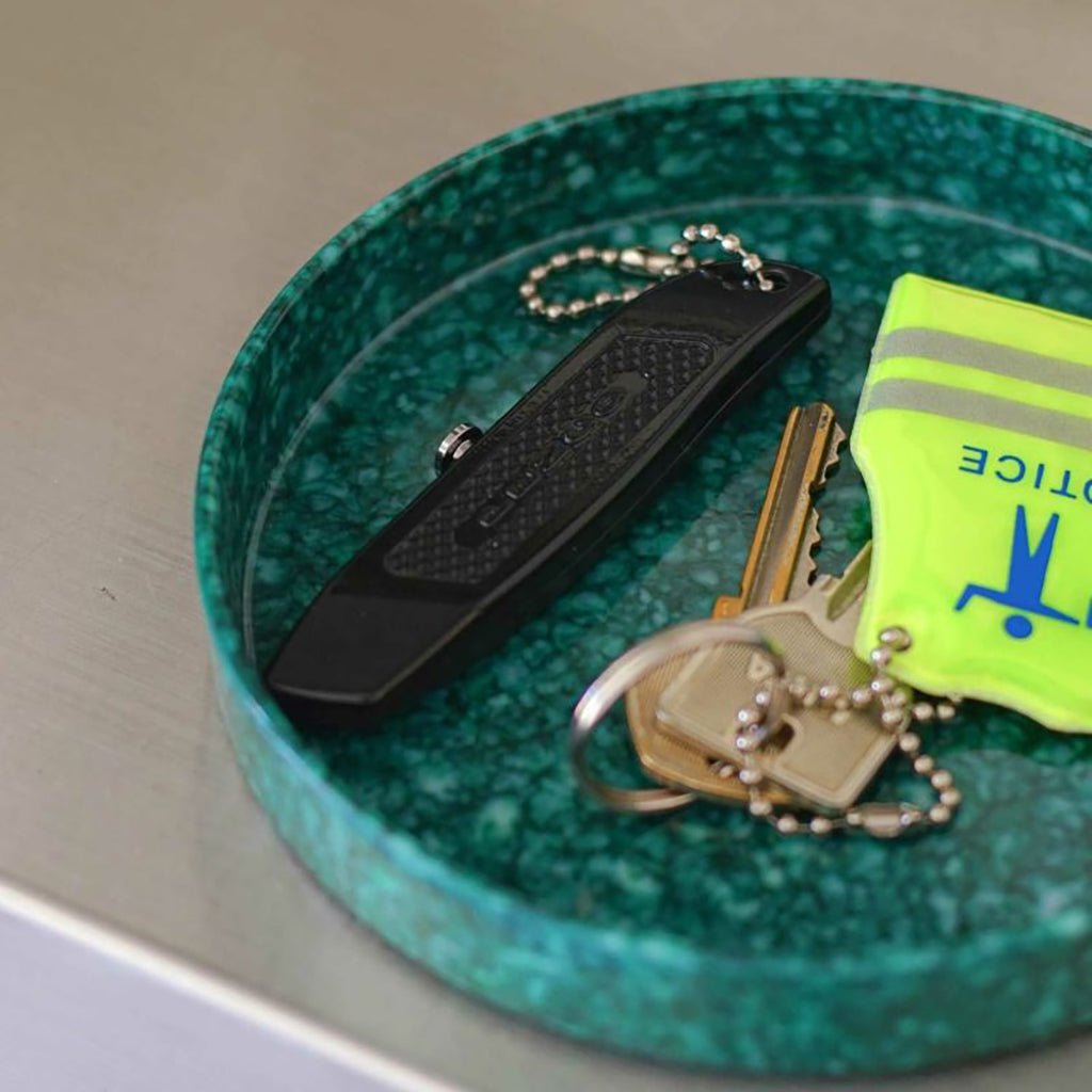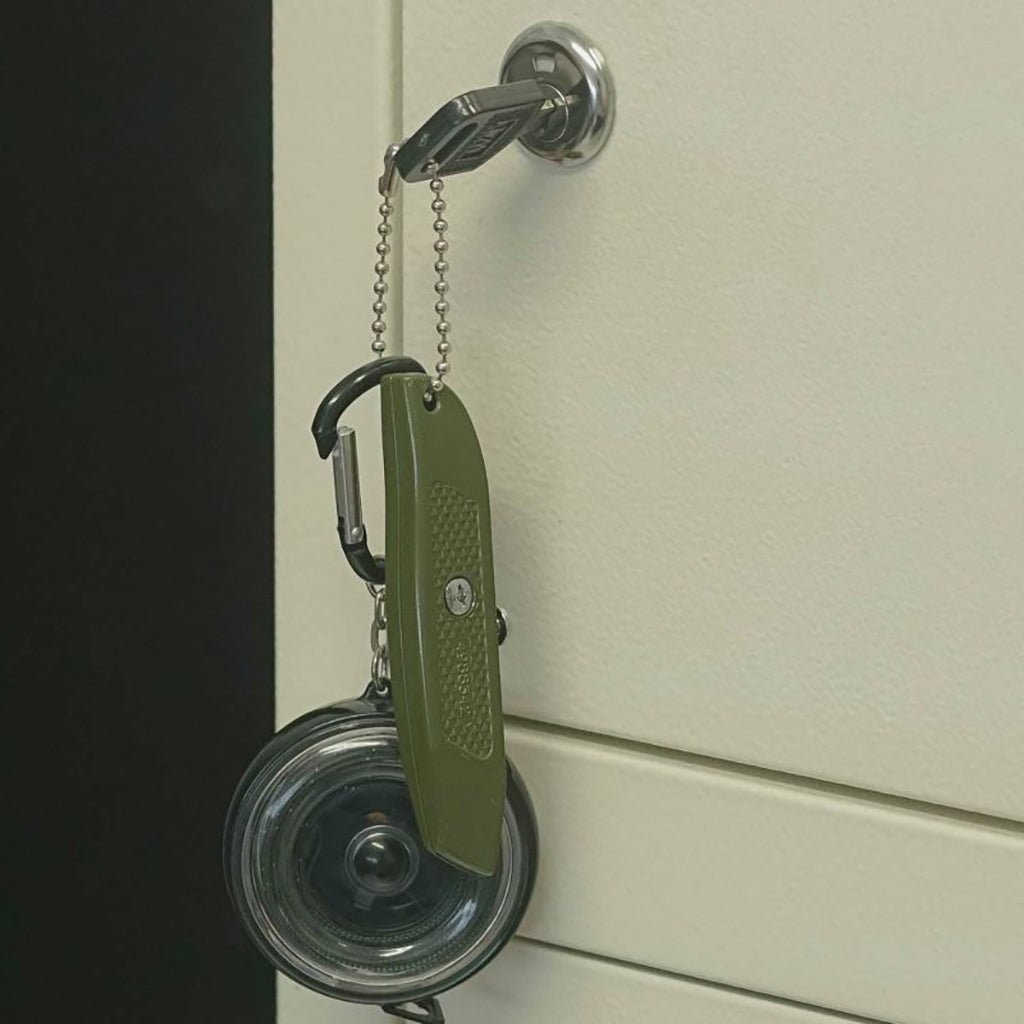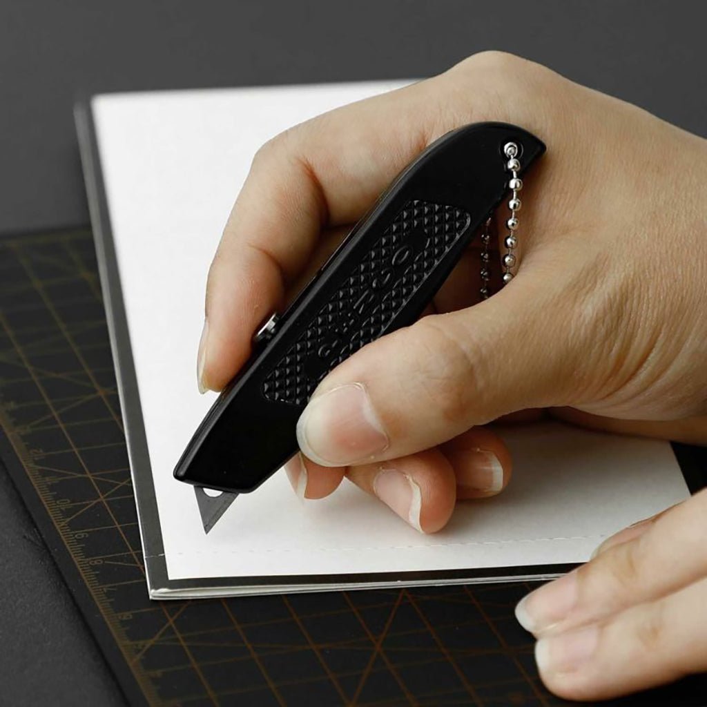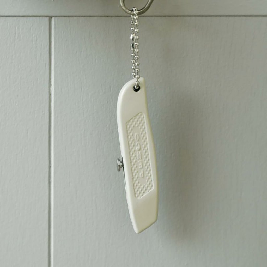 A pocket-sized metal utility knife by Penco. At just over 3" long, it tucks nicely into a pocket or bag. Comes with a heavy duty steel blade and a beaded chain which keeps it handy and at-the-ready for opening boxes or snipping strings and cords. The button on top locks the blade in two positions, for two blade lengths. The knife is endlessly refillable with replacement blades.