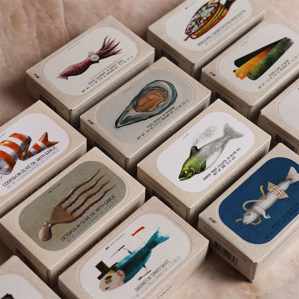Further Reading: José Gourmet sources exceptional seafood from the coasts of Portugal and Spain, working closely with local fishers and canneries that prioritize quality and tradition. Committed to fair trade practices, they often pay in advance and never bargain down prices. Their beautifully illustrated packaging, featuring the work of Portuguese artists, honors the people behind each tin—those whose livelihoods are rooted in lifelong dedication to the fisheries trade.