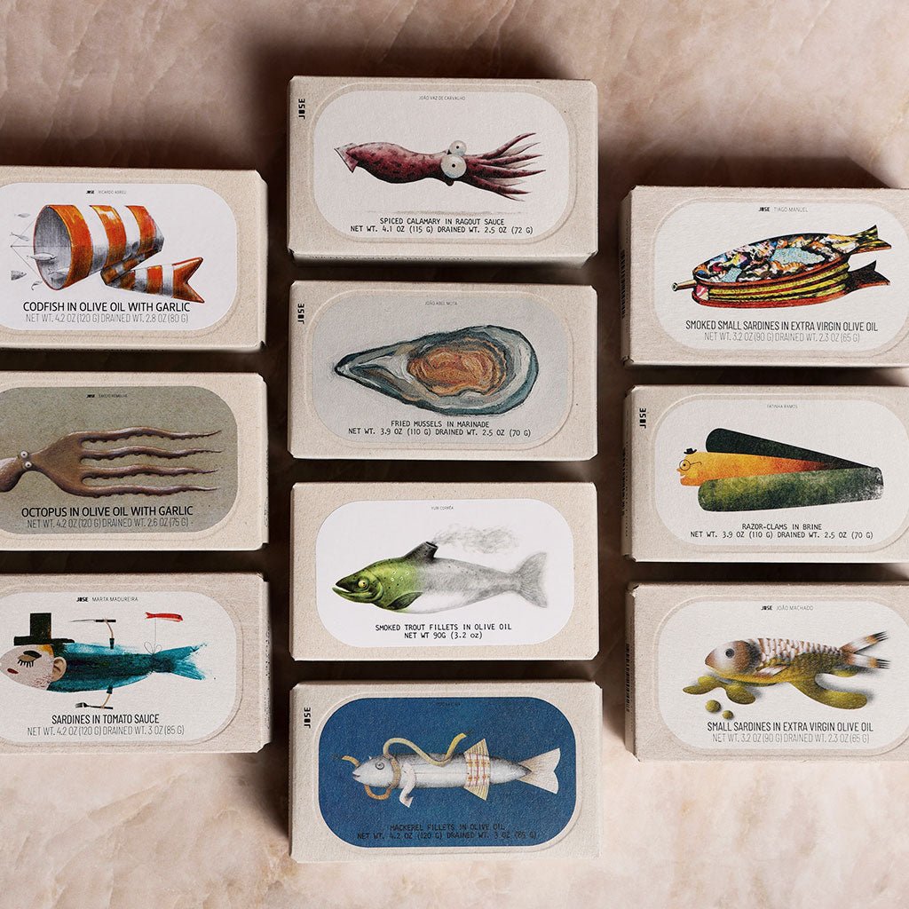 Further Reading: José Gourmet sources exceptional seafood from the coasts of Portugal and Spain, working closely with local fishers and canneries that prioritize quality and tradition. Committed to fair trade practices, they often pay in advance and never bargain down prices. Their beautifully illustrated packaging, featuring the work of Portuguese artists, honors the people behind each tin—those whose livelihoods are rooted in lifelong dedication to the fisheries trade.