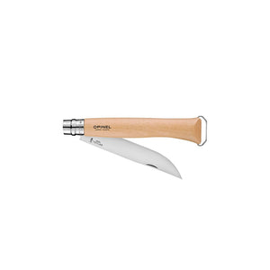 The No. 12B Stainless Steel Opinel folding knife is perfect for cutting meats, vegetables, and fruits, and features a beechwood handle from sustainably managed French forests, equipped with a bottle opener at the end.