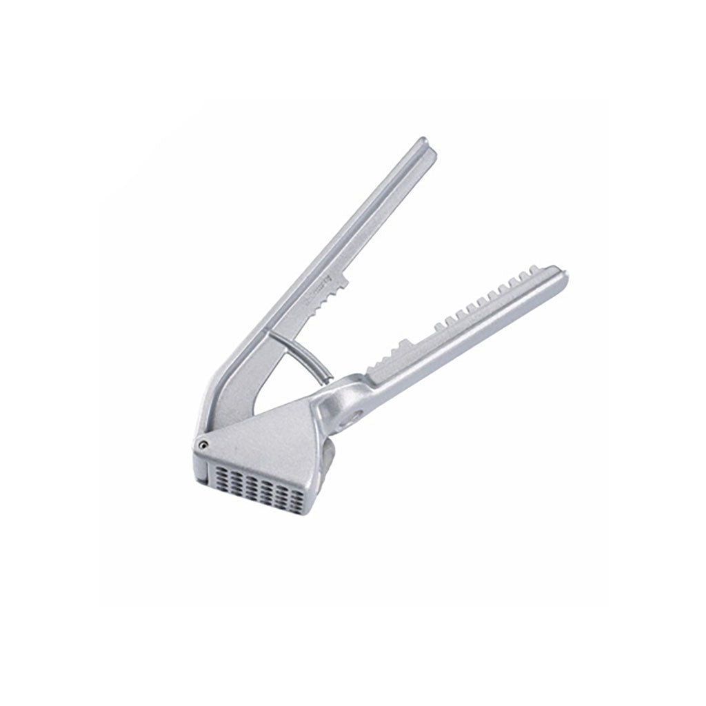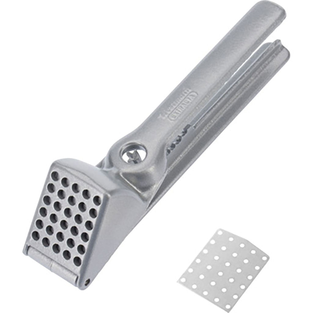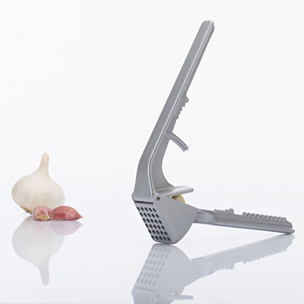 A multi-purpose kitchen tool for pressing garlic cloves or pieces of onion, this press can also be used to remove pits from cherries and olives, to crack nuts, or even to descale fish.