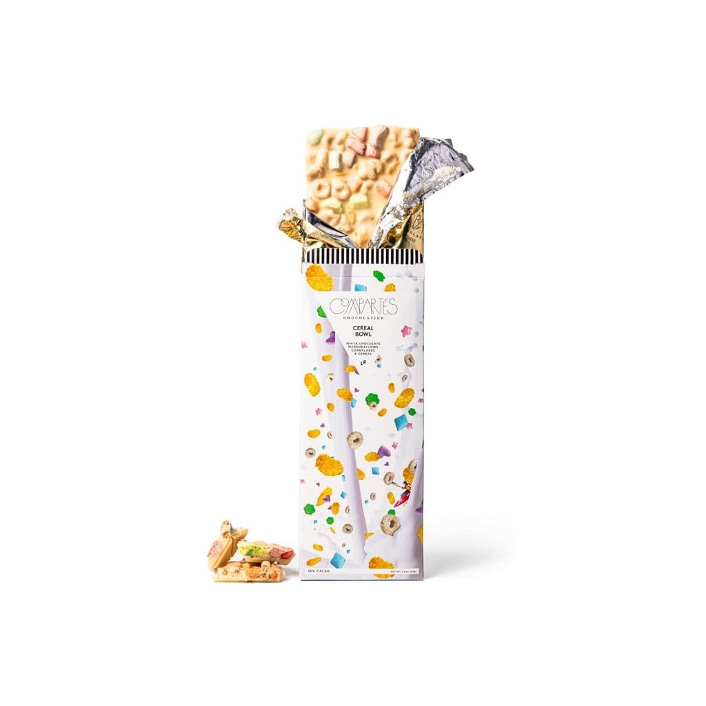 Compartés Cereal Bowl gourmet white chocolate bar is a cereal lover's dream. Creamy Compartés white chocolate overflowing with crunchy cereal and sweet marshmallows.