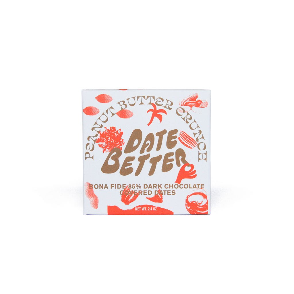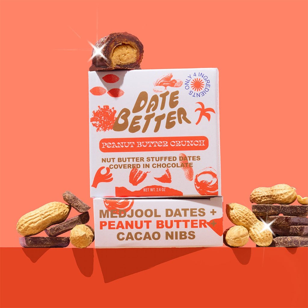 Peanut Butter Crunch is Date Better’s spin on the classic peanut butter and chocolate pairing. Each chewy Medjool date is stuffed with thick, natural peanut butter blended with crunchy cacao nibs for texture and depth. The cacao nibs are packed with beneficial compounds that support mood by boosting serotonin and dopamine levels.