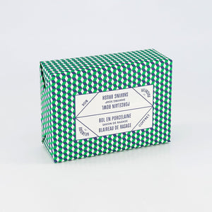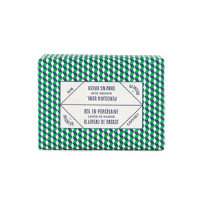 Le Baigneur's shaving soap is made in Paris and is enriched with extracts of calendula and St. John's wort, white clay, honey from Ile de France, and lavender hydrosol from Provence. It is gently scented with essential oils of vetiver and lavender and fits neatly into the unglazed, lidded porcelain bowl made in Limoges. The shaving brush is made from beechwood and natural hogs hair bristles.