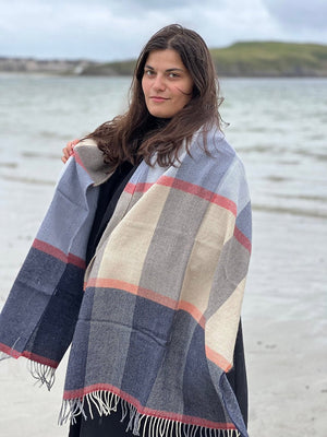 A generously-sized blanket scarf made of warm and cozy merino lambswool in County Donegal, Ireland. Softer than sheep's wool, merino can be worn by those who are normally sensitive to wool. The large size means it's wearable as a scarf, but can double as a wrap when the situation calls for it.