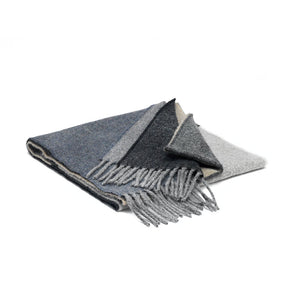 McNutt's Toyko scarf is woven of 100% Merino lambswool and features a color block design in neutral shades of gray and taupe, making this a versatile accessory for many outfits and occasions.