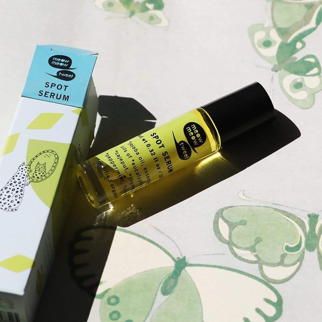 A powerhouse of organic essential oils, Meow Meow Tweet's Spot Serum discourages bacteria growth and combats blemishes. Suspended in jojoba oil, known for it’s similarity to the skin’s own sebum, this handy roll-on is the perfect solution to stop blemish growth, or shrink and heal existing spots. The scent is a strong crisp herbal and the texture is a silky oil.