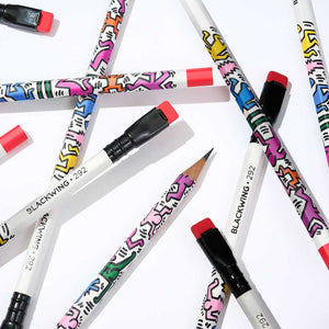 This box of 12 balanced graphite pencils is sure to spark your creativity and imagination. Each pencil features Haring's colorful dancing figures over a white background, and is capped with a black ferrule, holding Blackwing's iconic rectangular eraser in a bright red color. Balanced graphite offers depth and precision, making it well-suited for both writing and sketching.
