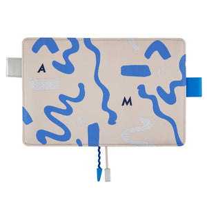 A cover for the Hobonichi Techo Original A6. This cover has a sandy-colored background woven with wavy blue lines that evoke the sea. Sparkling silver accents are reminiscent of the whitecaps of waves. The PAMM logo is woven in navy and silver threads. Butterfly pen holders function as a clasp to keep the cover securely closed with a pen, and ribbon bookmarks help you keep track of important pages in your planner.