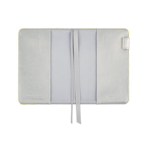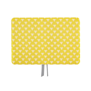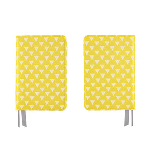 A cover for the Hobonichi Techo Original A6. The fabric is a brocade with an "uroko" design: triangles that symbolize scales in a pattern that originates from ancient China. The intricate weaving looks beautiful in vibrant yellow. This slim and simple cover has ribbon book marks and a pen hook on the inside.