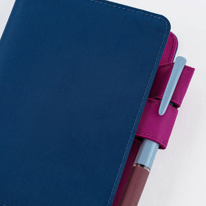 In a sophisticated deep blue color, this A6 cover has butterfly-style pen loops to keep your writing utensil handy, while also securing the cover shut. When open, you'll find a rich berry interior with plenty of pockets for keeping stickers, clippings, and other bits of daily ephemera.